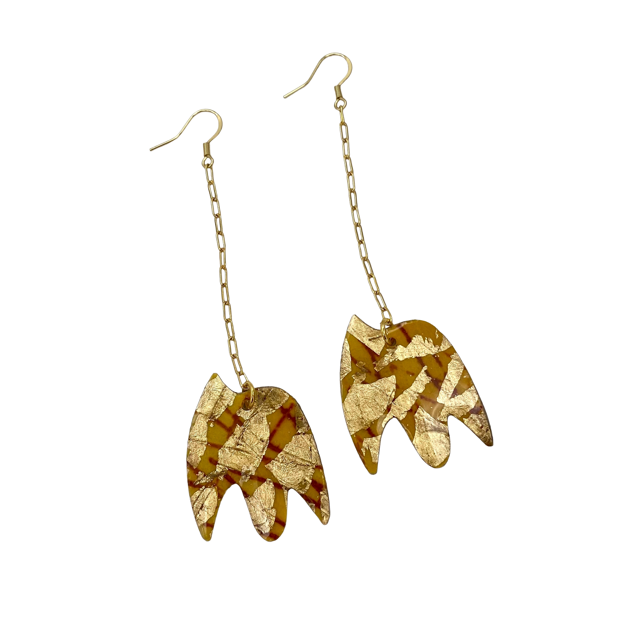 Sgraffito batik textile drops on delicate gold paperclip chain. They are finished with a high gloss sheen and measure 9cm in length.
