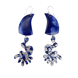 The Rorqual earrings are inspired by the Fin Whale and its environment. These statement pieces are crafted entirely by hand using the two resist techniques of batik/sgraffito and shibori to achieve both pattern and depth of colour. Each piece is lacquered to a high gloss durable sheen and due to the variations in shibori patterning is naturally one-of-a-kind. Please expect variations in hue- it’s part of the beauty and uniqueness of these processes!