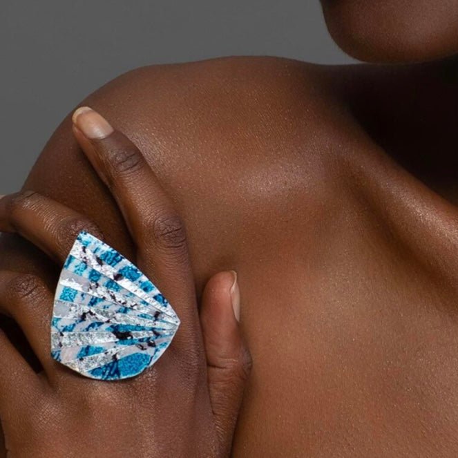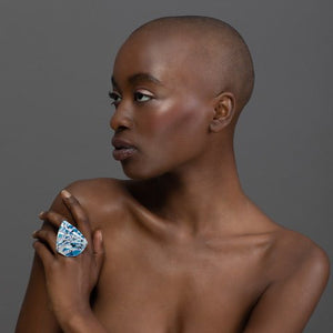Statement geo ring created using batik tjanting technique on remnant textile. Hand-dyed in cobalt and finished in high gloss eco resin with added precious silver leaf elements. This 43x50mm ring is adjustable. The metal is hypoallergenic silver-plated.